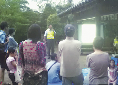 この日は約400人が鑑賞に訪れ、ホタルのささやかな光に癒された。同公園の日本庭園東屋では映画の上映会も行われ、子どもたちを喜ばせていた。