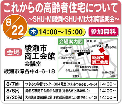 セミナーでは、専門家が、安全安心な高齢者の住まいについて講演する。また、徳洲会グループのサービス付き高齢者向け住宅「SHU(しゅう)―MI(み)綾瀬」「SHU―MI大和南」の説明会も開かれる。