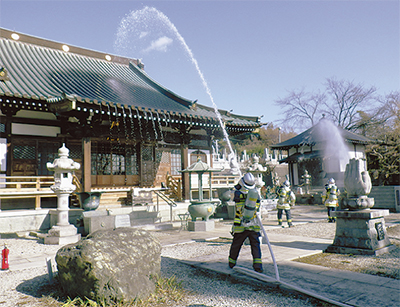 訓練は消防署との合同で行われ、本堂と市指定文化財である欄間彫刻が安置されている地蔵堂の延焼防止活動が行われた。