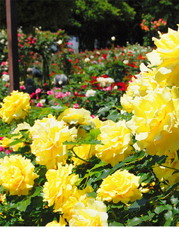 光綾公園のバラ園には、28種約900本が咲き誇る。両公園とも6月中旬頃まで楽しむことができる。