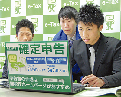 2人は税務署員の説明を受けながら、真剣な表情で名前や前年の収入などをパソコンに入力。わずか10分ほどで確定申告を終わらせた。終了後、尚弥さんは「e-Taxを使うのは初めてでしたが、パソコンを普段使わない自分でも簡単でした」と話し、拓真さんも「もっと難しいかなと思ったけど意外と簡単」と話していた。