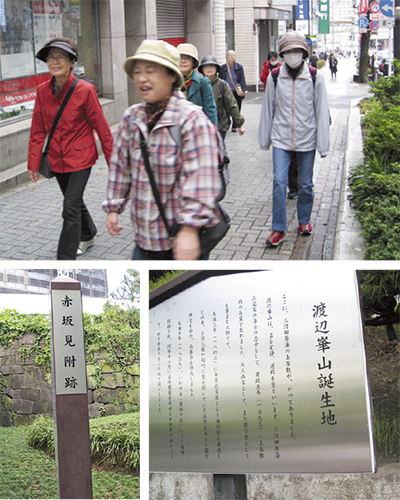 お銀の生家を発った一行は初日でさがみ野まで歩き、続いてすずかけ台、鷺沼、用賀、渋谷まで踏破。最終日には途中で江戸城外堀跡の「赤坂見附跡」=写真左下=なども見学し、目的地である渡辺崋山生誕の地(田原藩上屋敷跡)=写真右下=に到着した。