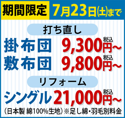 創業90年を超える老舗「長田寝具センター」が冬布団の片付けをするこの時季に打ち直しや羽毛ふとんのリフォームセールを行っている。7月23日(土)まで。