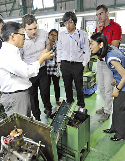 (株)ミズキは精密ネジやシャフト、精密金属加工部品などを製造する会社。TAMA協会員であり、タイや香港、ラオスなど積極的な海外進出を行っているため見学対象になった。「ビジネスプランは今後の参考になるし、新鮮な目線での質問や意見は勉強になります」と同社担当は話した。