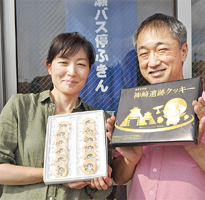 「市の職員と一体になって作り上げた一品」と自信をのぞかせる石井さん夫妻。「あやぴぃ」はクッキー自体にもプリントされているほか、パッケージの表面左下には神崎遺跡のPR文が刻まれている。