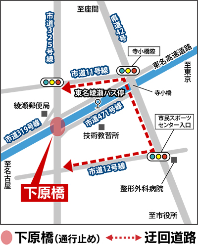2018年3月開通予定の(仮称)綾瀬スマートインターチェンジ(SIC)整備に伴う「下原橋」の架替工事のため、今年1月29日から同橋が全面通行止めになる。