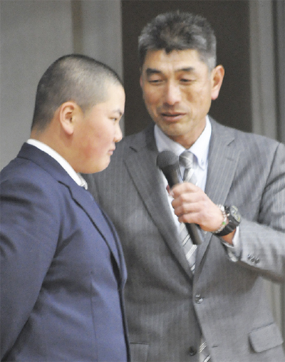 当日は学活の時間を使い、1年生全員が体育館に集合した。登壇した荒井監督は「野球部の人」と問いかけ、その中の一人である小松原雄大さんを檀上に呼び寄せた。
