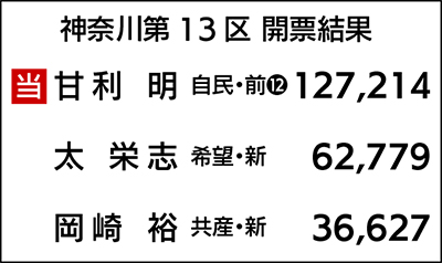 台風21号の影響による暴風雨の中、10月22日、第48回衆議院選挙の投開票が行われた。綾瀬市を選挙区に含む神奈川13区は、自由民主党の前職・甘利明氏が、県内で当選した議員では最多となる12度目の当選を果たした。