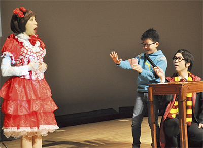 学んだのはトランプマジック、超能力マジック、フルーツカードマジック、透明なカップを使った出現マジックの4つ。講師たちはキットのタネに気付かれないための角度や演出などのコツを、丁寧に説明した。また、練習したそれぞれのマジックは、代表者1人が舞台に上がり即興の演技を交え披露した=写真。