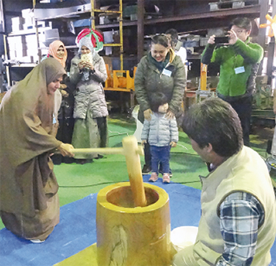 日本語クラスあやせ未来塾(渡邉誠一委員長)が、吉岡東の栄和産業で課外授業「餅つきで国際交流を!」を開催。子ども7人を含む60人が参加し、伝統的な日本の餅つきを楽しんだ。