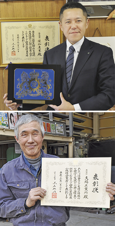 県がこのほど、ものづくり産業の発展に貢献している優良工場11社と、優良小規模企業者18者を表彰した。綾瀬からは優良工場に(株)栄和産業(吉岡東4の15の5/伊藤正貴社長)と、優良小規模企業者に(有)大場工業所(吉岡東3の3の40/大場洋美会長)の2社が選ばれた。