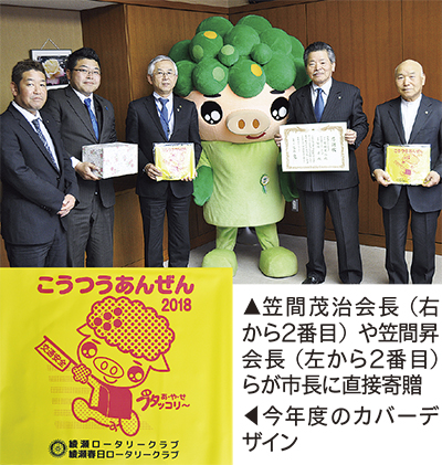 綾瀬ロータリークラブ(笠間茂治会長)と綾瀬春日ロータリークラブ(笠間昇会長)が3月20日、新入学児童向けの損害保険付ランドセルカバー995枚を市に寄贈した。