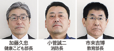 ▽健康こども部長(同部参事兼健康づくり推進課長)加藤久忠▽消防長(消防本部参事兼消防総務課長)小菅誠二▽教育部長(同部参事兼教育総務課長) 市来吉博