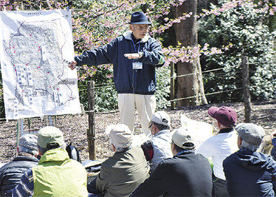 この日、市が発行する「あやせウォークガイド」の渋谷氏コースを歩いた同クラブ。見学ポイントの1つであり、県指定史跡でもある早川城跡(城山公園)で、青空講座が行われた。咲き誇る河津桜と抜けるような晴天のもと、参加者らは高橋さんの話に聞き入った。
