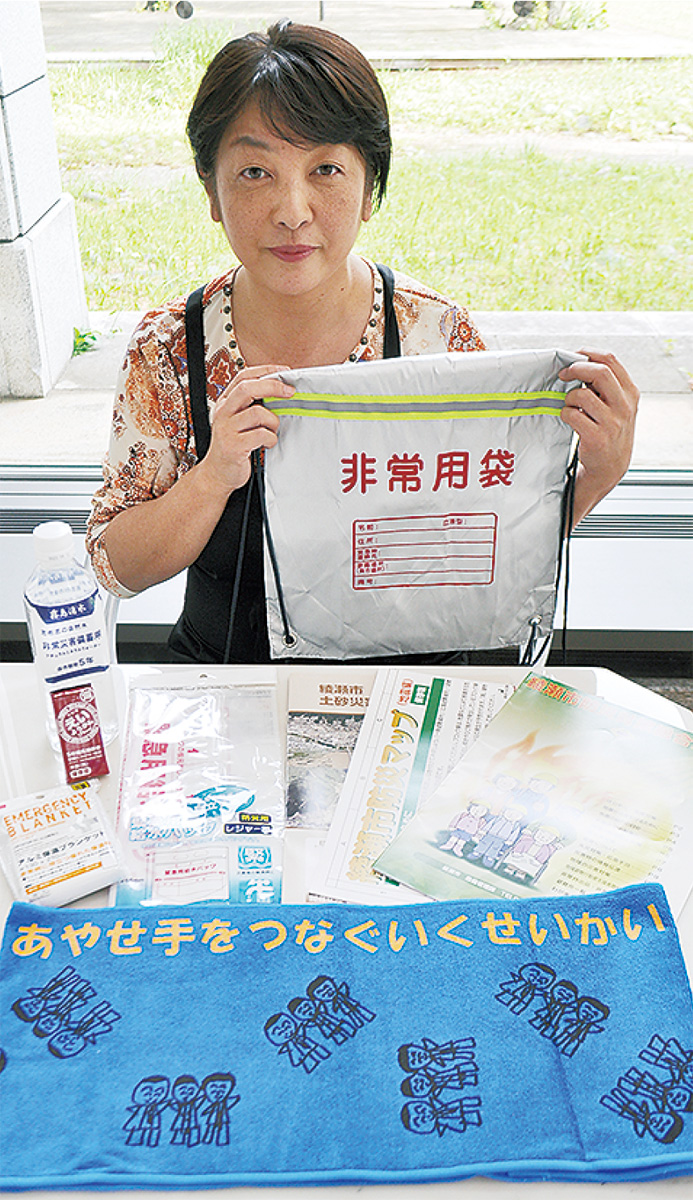 会員らと様々な話をする中で、2011年の3・11後に作った防災セットの非常食の賞味期限が切れている家庭や、そもそも持っていない家庭が多かったことが判明した。会長自身、研修で訪れた大分県で熊本地震に遭遇したこともあり、防災セットを軸にした意識の見直しに着眼。公共施設などに備え付けられている非常用袋などを参考に会で内容を考え、市内や近隣の100円ショップなどを手分けして回り60セット分を揃えた。