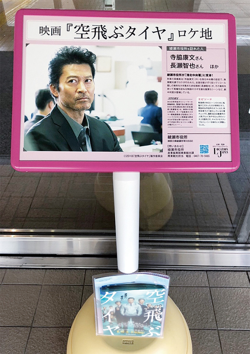 「空飛ぶタイヤ」は、池井戸潤作品として初めて映画化され、6月15日から公開されている。綾瀬では、運送会社社長・赤松徳郎(長瀬智也さん)が高幡真治刑事(寺脇康文さん)に会うため港北中央署を訪れるシーンが、市役所で撮影された。