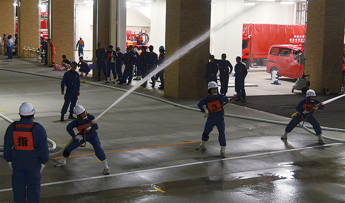 綾瀬・海老名・座間で構成される神奈川県消防協会高座支部合同訓練として、初の実施。緊張感が漂う中、各市の代表チームがポンプ車操法の演技を行った。支部事務局の菊池徹さんは、「大会の雰囲気に慣れ、切磋琢磨してもらうことが目的。他の団の訓練を見る機会は少ないので、勉強にもなる」と話す。