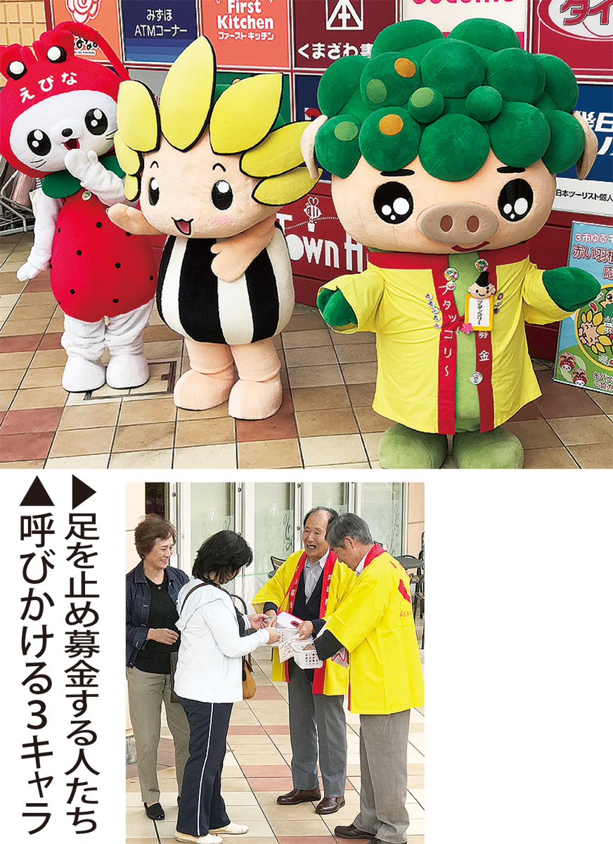綾瀬市公認キャラのブタッコリ〜も、ボランティアが手作りしてくれたという法被を着て募金を呼びかけ。市社会福祉協議会では、「3キャラが揃うことで目立つのか、足を止めてくれる人がいつもより多いと感じます」と、その効果を実感していた。
