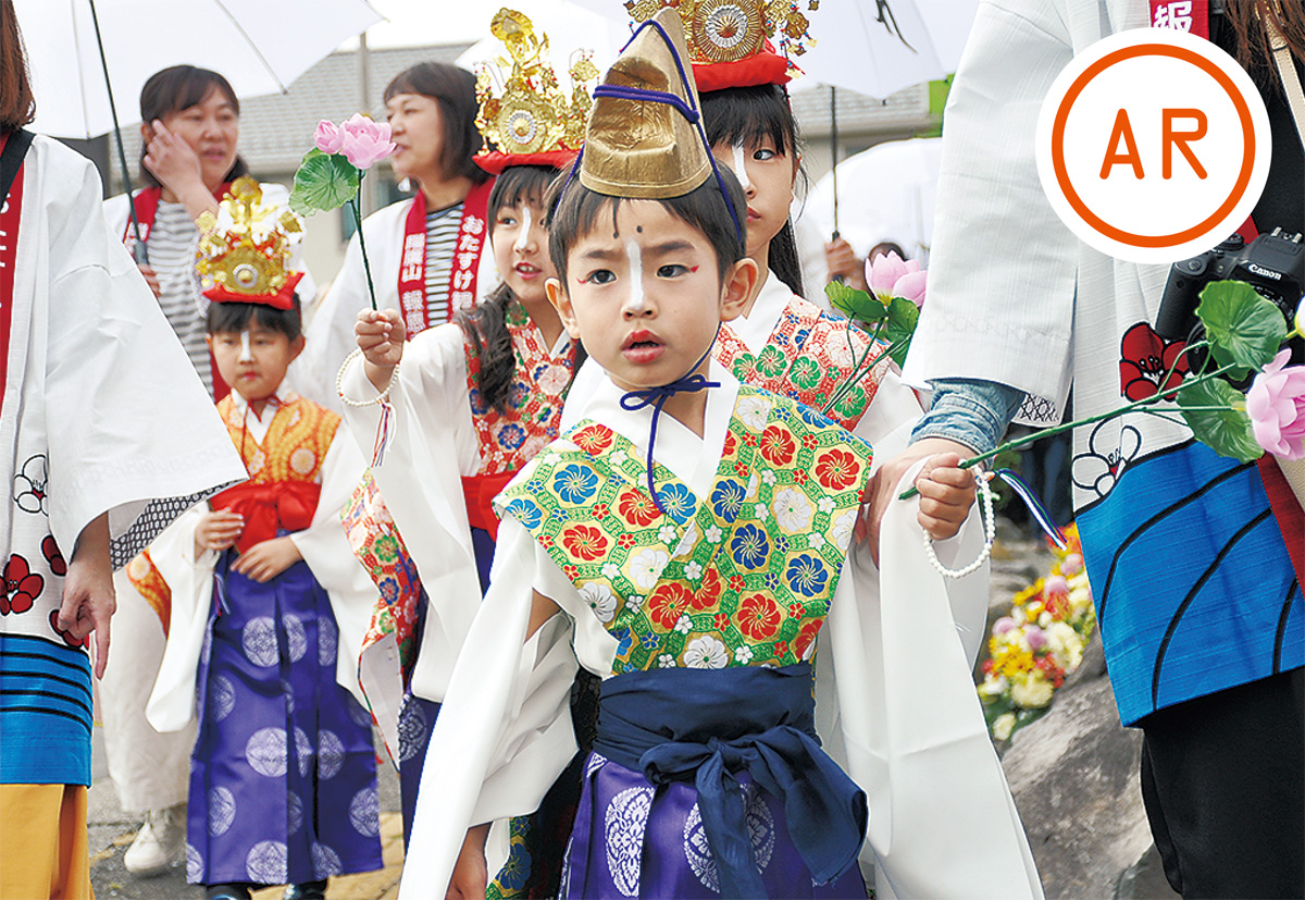 古式の中にも住職のこだわりが組み込まれており、稚児の記念撮影をした「白山妙理大権現」を描いた巨大スクリーンは、その一つ。また、関係者が着た法被には、おたすけ観音の「梵字」と曹洞宗開祖・道元禅師が好んだという「梅」、住職の名前の一字「海」を表す「波」が描かれ、そのまま進呈されている。