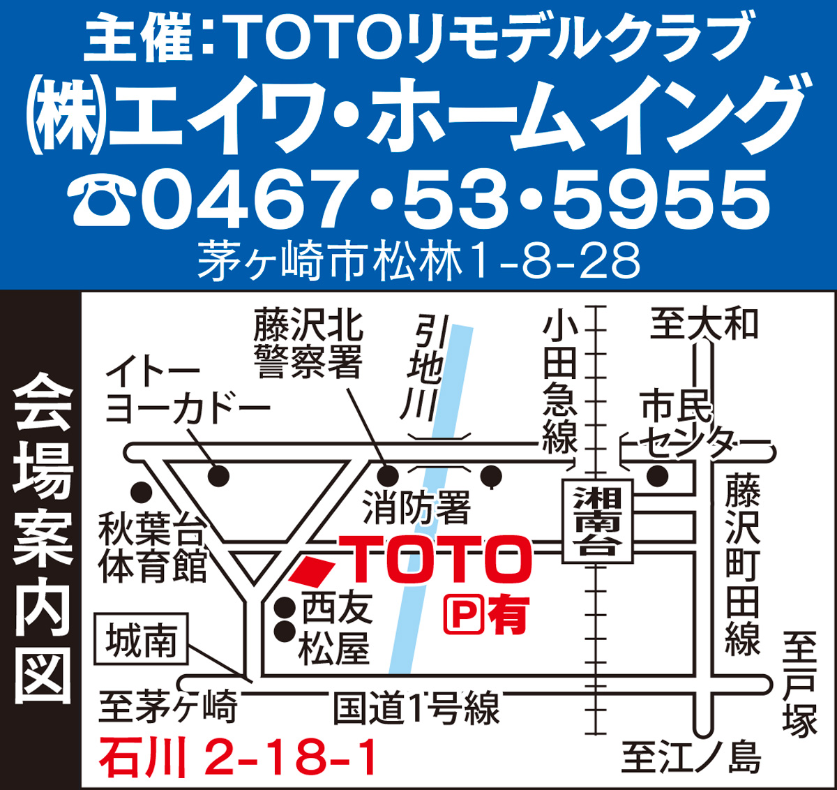 肩と腰に降り注ぐ水流で全身を効果的に温める人気バスルーム『SYNLA(シンラ)』を体感できる。主催は(株)エイワ・ホームイング(茅ヶ崎市)。地元企業なのでアフターケアも万全。見積無料。本紙持参で粗品進呈。「冬を前に浴室リフォームをご検討下さい」と同社。