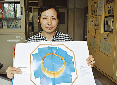 作品(=写真上)は、イカの吸盤の骨を撮影し、貼り合わせたもの。題名に「輪」や「イカリング」という言葉があるように色々なものを連想させる。1・5m角で額縁なども全て手づくりだ。宮本さんは「ミクロの世界は芸術的なイメージの宝庫。自然なカタチの不思議さには、自分も含めた宇宙のつながりを感じさせられるようなところがあり、魅了されてしまうんです」と話していた。