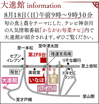 旅館という文化と歴史を守りつつ、時代やお客様ニーズに合わせた質の高いサービスを提供することが大進館のモットー。宿泊客室は本館に3室、そして露天風呂付きの離れが2室で1日5室限定。露天風呂付の客室でなくても2種類の貸切風呂が楽しめるなど、小さな宿ならではの行き届いた「おもてなし」が売りだ。このほか、用途に合わせて宴会場が4室。最大100名までに対応する。10名以上なら、同館の最寄駅や会社などから無料送迎というサービスも大好評だ。