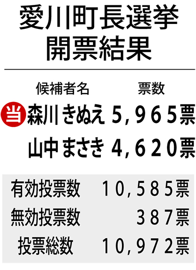 3期12年に渡って町長を務めた山田登美夫氏の引退表明により、森川絹枝氏(会社役員・62歳)と山中正樹氏(大学教員・50歳)、新人同士の一騎打ちとなった愛川町長選挙。愛川町は山田町長まで40年に渡り役場出身者が町長を務めていたこともあり、どちらが就いても民間出身者による新体制で、選挙戦は注目を集めるかに思われた。