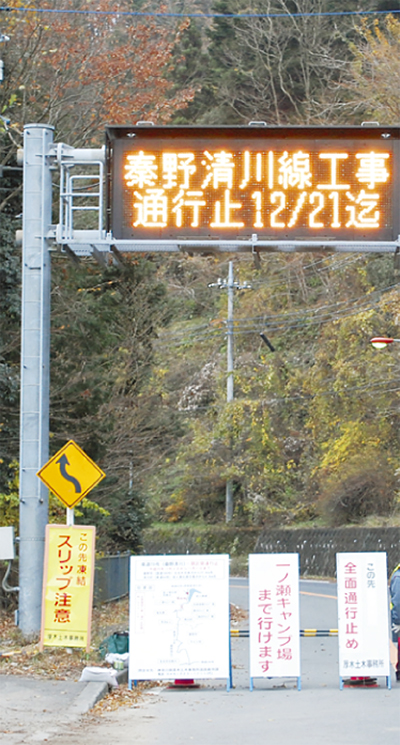 清川村宮ヶ瀬と秦野市を結ぶ県道70号線(秦野清川線)の「国際一ノ瀬キャンプ場」から「唐沢キャンプ場」の区間が12月21日まで自動車、自転車、歩行者全て通行止めとなっている。