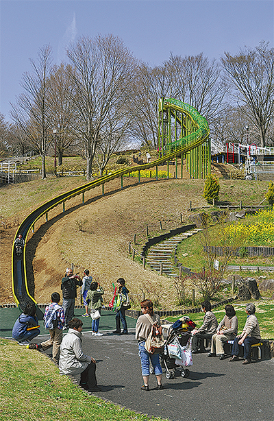 摩擦抵抗が少なく静電気が起きにくいなどの特徴があるという超高分子量ポリエチレン製で、同種類のスライダーでは日本一の長さだという。本体は、春は菜の花、秋にはコスモスが咲く公園内になじむようにと淡い緑を基調にデザインされている。