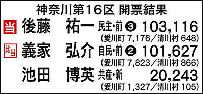 第47回衆議院総選挙は12月14日に投開票され、小選挙区神奈川16区(厚木市・伊勢原市・愛川町・清川村・相模原市の一部)は民主党前職の後藤祐一氏(45)が自民党前職の義家弘介氏(43)を破り、小選挙区の議席を奪還した。義家氏は比例区で復活当選。共産党の池田博英氏(52)は及ばなかった。