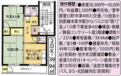 今回ご案内するキャンペーン対象物件は「中津桜台賃貸住宅」。小田急小田原線本厚木駅よりバス約21分「西1丁目」バス停徒歩4分、2DKで賃料3万8300円〜。本厚木駅へのバス便は通勤通学時間帯に一時間6本。ファミリーはもちろん、法人・学生・単身入居も可。コンビニ・飲食店・美容院・接骨院・歯科医院・保育園が徒歩10分圏内、小中学校も徒歩20分圏内と生活環境充実。マルエツ中津店まで車4分。春は中津川沿いの桜が楽しめる。
