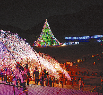 期間中はロードトレイン「ミーヤ号」が特別ダイヤで運行する。長さ315mに及ぶ大つり橋、メイン階段にかかるアーチ状の光のトンネル、水の郷商店街のイルミネーションロードと、会場内はフォトスポットも盛りだくさんだ。