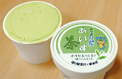 このアイスは、同館を担当する村産業観光課が「新しい村の目玉に」と、厚木市農業協同組合の協力を受けて作製した。パウダー状にした清川のお茶が練りこまれ、風味豊かですっきりとした味わいだ。