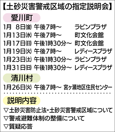 神奈川県が進めている「土砂災害警戒区域(イエローゾーン)」指定のための調査で、愛川町と清川村の急傾斜地などの調査が完了し、清川村の住民に向けた説明会が12月13日、村住民センターで開催された。今後も愛川町と清川村で説明会が予定されている。
