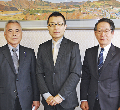愛川町半原出身の歌舞伎役者、中村歌女之丞(かめのじょう)さんが3月10日、小野澤豊町長と小島総一郎議長を表敬訪問した。