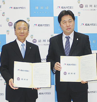 子育て世代の移住・定住促進の強化を図るため、清川村と積水ハウス株式会社神奈川シャーメゾン支店(厚木市)が「連携と協力に関する包括協定」を結び、3月11日には村生涯学習センターせせらぎ館で締結式が行われた。