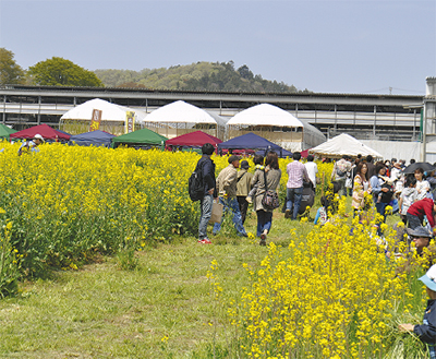 有志が約1200坪の休耕地を利用して菜種を栽培したのをきっかけに始まった同祭。見晴らしの良い会場では天然酵母パン、手作り雑貨、はちみつなど模擬店が多数出店。和太鼓やバンド、抽選会などのイベントも予定されている。さらに、当日は無料の菜の花摘み体験もある。