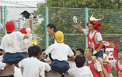 武田軍大将を務めた梅澤壮良君(3年)と北条軍大将の美月赤彦君(同)は、小学校も同じ幼馴染。守りを固める作戦は「練習で思いついた」と梅澤君。練習試合でもいい結果が出ていたという。同じ陣形を取った北条軍だが、美月君は「このままではいつまでも終わらない」と、攻める選択を貫いた。お互いに合戦まつりに行ったことがないそうだが、「興味が出てきた」と笑顔。同校の中村正校長は「新たな伝統種目として、次年度以降も取り組んでいきたい」と話す。
