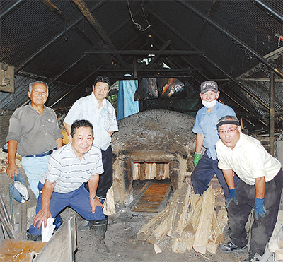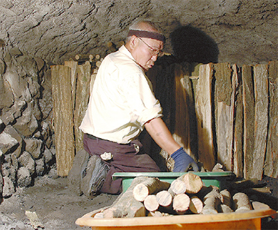炭の材料となる材木は、一般家庭の庭木の手入れなどで出たものを貰い受けている。15年間使い続けている専用の窯でじっくりと燃やし、燃料用の炭にする。難しいのは火を止めるタイミング。約3日間燃やし続け、煙の色や温度の変化で見極めるという。