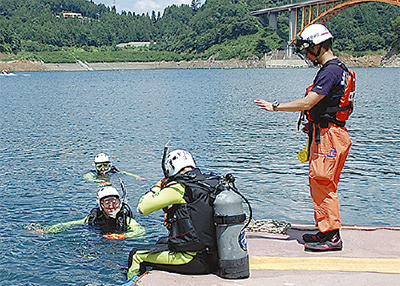 厚木市消防本部と相模原市消防局が7月28日と29日、宮ヶ瀬湖のカヌー漕艇場で潜水訓練を行った。
