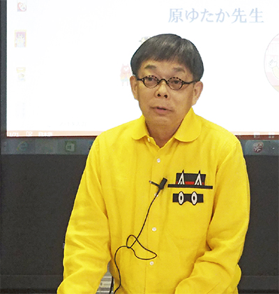 愛川町文化会館で9月3日、中津小学校、高峰小学校、愛川中学校の3校のPTAが合同講演会を開催した。今年で30周年を迎える人気児童書「かいけつゾロリ」の作者である原ゆたか氏が講師に招かれ、誕生秘話やストーリーの作り方などを語った。