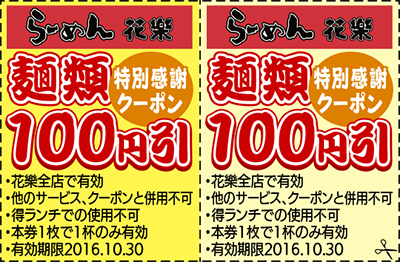 素材にこだわり、手作りにこだわった定番の味自慢メニューは味噌、醤油、塩、とんこつなどバリエーション豊富でリーズナブル。さらに、今回もやります!花樂のらーめんをお得に楽しめるタウンニュース読者限定100円引きクーポン再登場!食欲の秋はやっぱり「らーめん花樂」で決まり。