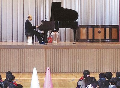 愛川町の半原小学校で11月30日、全盲のピアニスト島筒英夫さんが講演と演奏を行った。