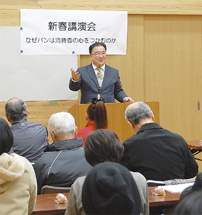 愛川地区まちづくり協議会の新春講演会が1月23日、愛川町半原の原臼児童館で開催された。講師には株式会社オギノパンの常務取締役である荻野隆司氏が招かれ、消費者の心をつかむ商売繁盛の秘訣や工夫を語った。