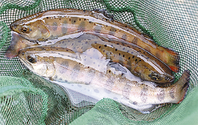今年の相模川水系の渓流釣りシーズンは3月1日から10月14日(土)まで。手軽にアクセスできる釣り場として人気の中津川では、角田大橋から宮ヶ瀬ダム下の魚止めの堰堤まで人気のポイントが多数あり、餌釣りやルアー、フライで楽しむ姿が多く見られる。町田市市から来たという男性も3尾のヤマメを手にしていた。