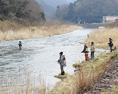 本谷川・塩水川・中津川・谷太郎川など相模川水系の渓流釣りが3月1日から解禁になった。この日を待ちわびた釣りファンたちで初日から各河川は賑わい、ヤマメやイワナ、ニジマスとの再会を楽しんでいた。