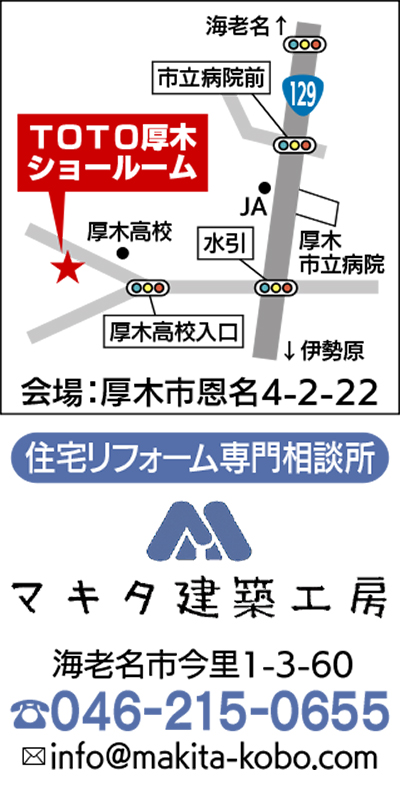厚木市恩名にあるTOTO厚木ショールームで3月25日(土)と26日(日)、「住まいのリフォーム相談会」が開催される。午前10時から午後5時まで。入場無料で、予約不要。主催は、マキタ建築工房(牧田達晃代表)。