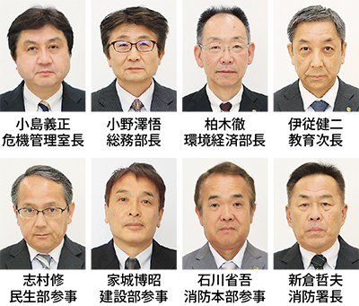 ▽危機管理室長・小島義正(同室長(参事))▽総務部長・小野澤悟(同部総務課長(兼)選挙管理委員会事務局長)▽環境経済部長・柏木徹(総務部企画政策課長)▽教育次長・伊従健二(総務部参事(兼)管財契約課長)