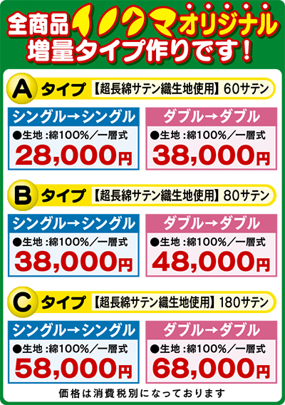新品同様に羽毛が生き返ると評判の「羽毛ふとんリフォーム」。ただ今、シングル28000円(各種タイプ有り)より実施中。