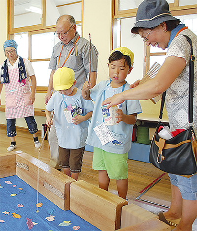 これは、同園が毎年行っている恒例のお祭り。園児の祖父母たちが同園を訪問し、園児と一緒に様々な遊びで楽しむ。この日は、輪投げやくじびき、サッカー、魚釣りゲームなど、多彩な遊びが用意され、園児と高齢者が一緒になって楽しんだ。
